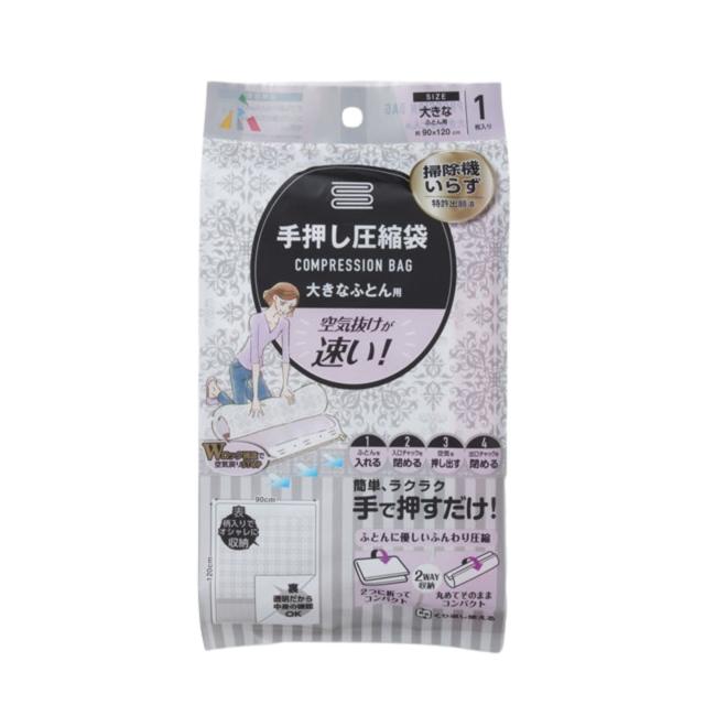 掃除機が無くても簡単に布団が圧縮できる布団用圧縮袋です。手で押すだけで楽に空気が抜けて、圧縮弁とチャックのWロックで空気戻りの心配もありません。かさばる布団をあっという間にぺったんこにし、空いた空間を新たな収納スペースとしてお使いいただけます。