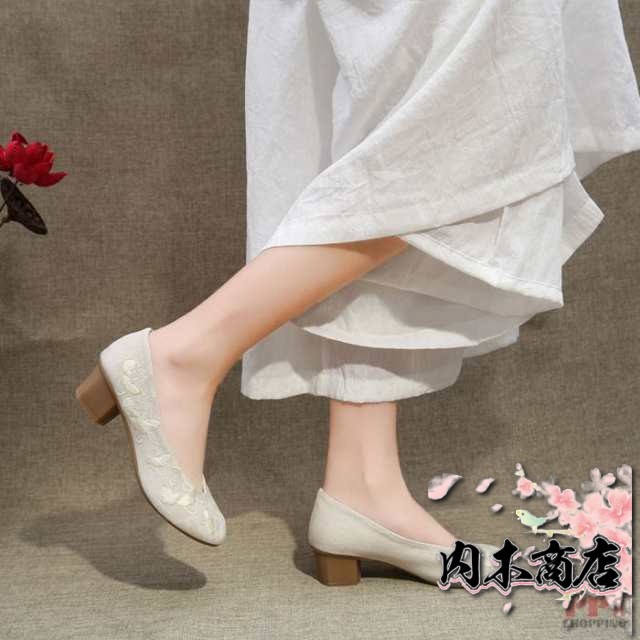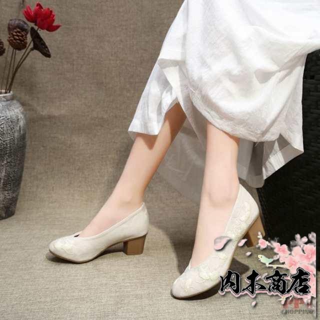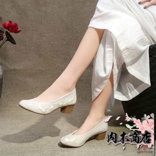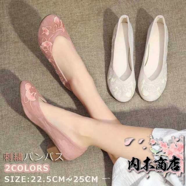 パンプス レディース 靴 麻 リネン 刺繍 花 太ヒール かわいい 大きいサイズ シューズ お出かけ痛くない 歩きやすい ローカット 夏靴 幅広 通勤 通学 普段履き 美脚 滑り止め 柔らかい 軽量 森ガール 母の日 女性 プレゼント ギフト 20代 30代 40代 50代