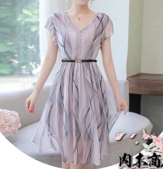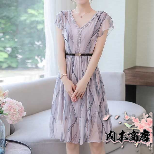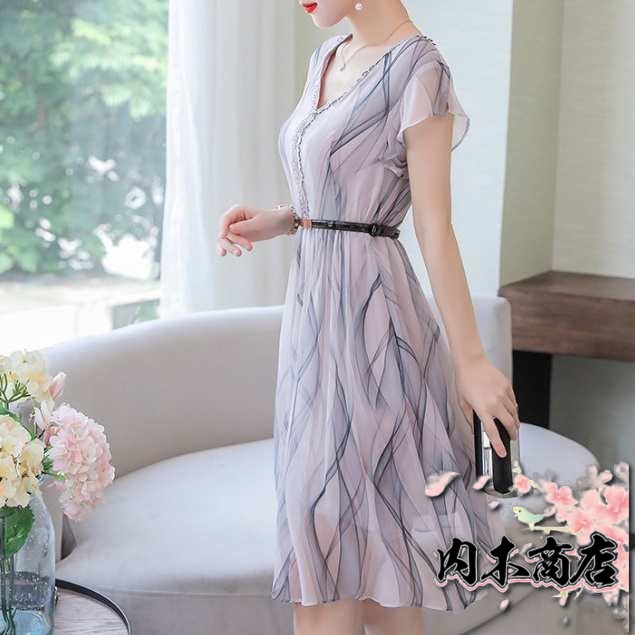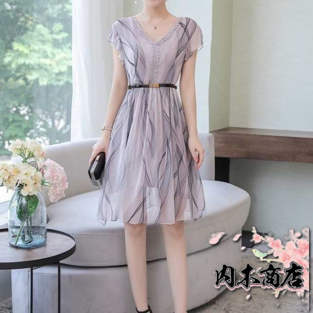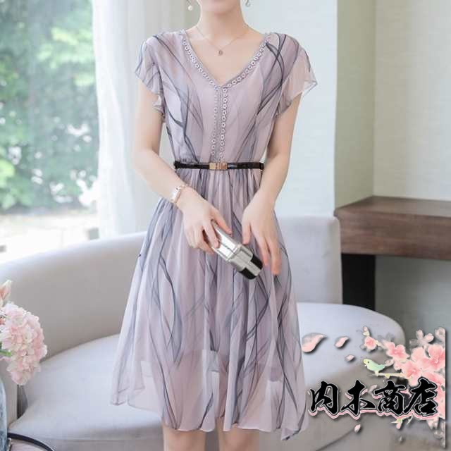 売れ筋アイテム ランキング常連 軽量仕様 毎日使える便利品 在庫わずか 細ベル Vネック 夏 新作 ハイウェスト 半袖 ミドル丈 Aラインスカート プリント柄 エレガントワンピース ポリエステル生地 軽い フレア袖 お買い得プライス
