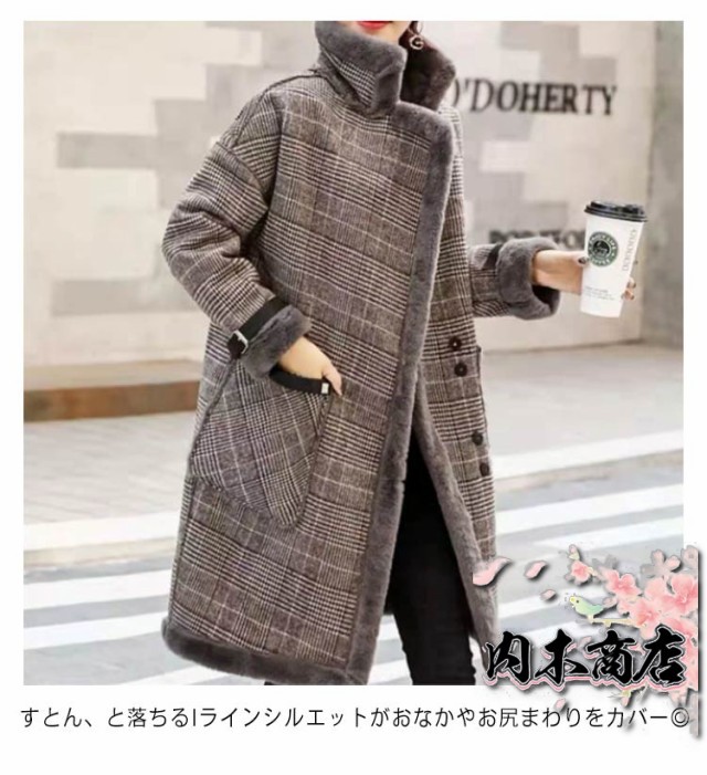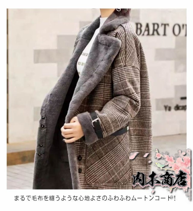 ムートンコート レディース グレンチェック チェスターコート ボア ジャケット もこもこ あったか フェイクムートン 裏ボア ボアコート アウター フェイクファー 裏起毛 長袖 ゆったり 秋冬 ロングパーカー 厚手 ボア 暖かい 羽織り