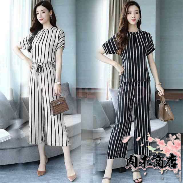 セットアップ レディース オシャレ 夏 40代 半袖 ストライプ 大きいサイズ 上下セット 通勤 韓国風 七分丈パンツ 2色