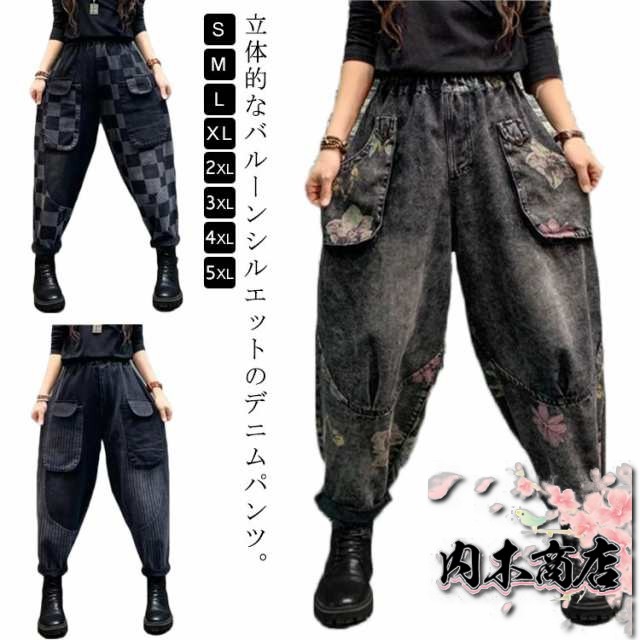 バルーンパンツ レディース デニムパンツ ワイドパンツ コクーンパンツ ズボン ボトムス ジーンズ 大きいサイズ レディース パンツ 花柄 春 夏 秋 体型カバー 着痩せ サルエルパンツ ユーズド風 サーカスパンツ タックパンツ 30代 40代 50代