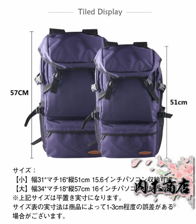| サイズについての説明 | サイズ: 【小】幅31*マチ16*縦51cm 15.6インチパソコン収納可能 【大】幅34*マチ18*縦57cm 16インチパソコン収納可能 ※上記サイズは平置き実寸になります。 サイズ表の実寸法は商品によって1-3cm程度の誤差がある場合がございます。 |