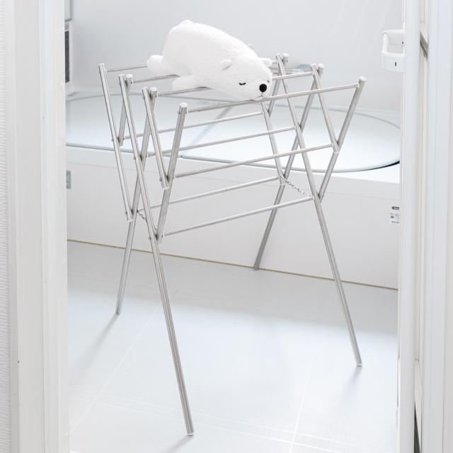 スペースや洗濯物の量に合わせて本体幅の調節ができる、折りたたみ式のステンレス物干しです。シンプルで使いやすい形状で、バスタオルなど干し部7本に効率よく干せます。サビに強いステンレス製なので浴室やベランダでも使えます。組立て不要の完成品なのも嬉しいポイントです。