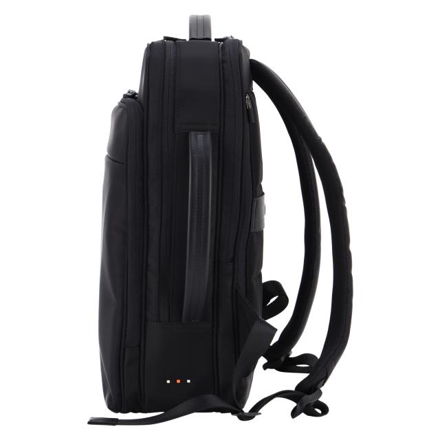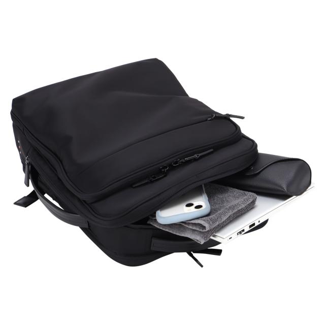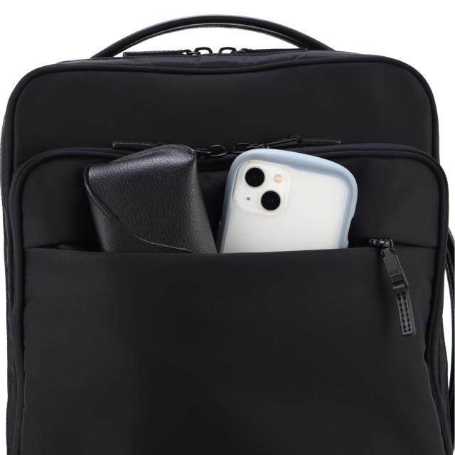 「理想の仕事バッグ」をカタチにした、IS/IT×マイナビのコラボ企画。多彩な機能性とスタイリッシュさを兼ね備えたビジネスリュックです。シンプルなブラックのデザインは、どんなビジネスシーンにもマッチし、洗練された印象を与えます。本体素材には撥水性に優れたナイロンを採用しているため、雨の日でも安心して使用することができます。13.3インチのノートPCが収納可能なポケットを含む多彩な収納スペースも魅力です。また、キャリーバッグに簡単に取り付けられるセットアップベルト搭載で、出張や旅行にも最適です。付属のサコッシュポーチは、単体でも使える便利なアイテムです。