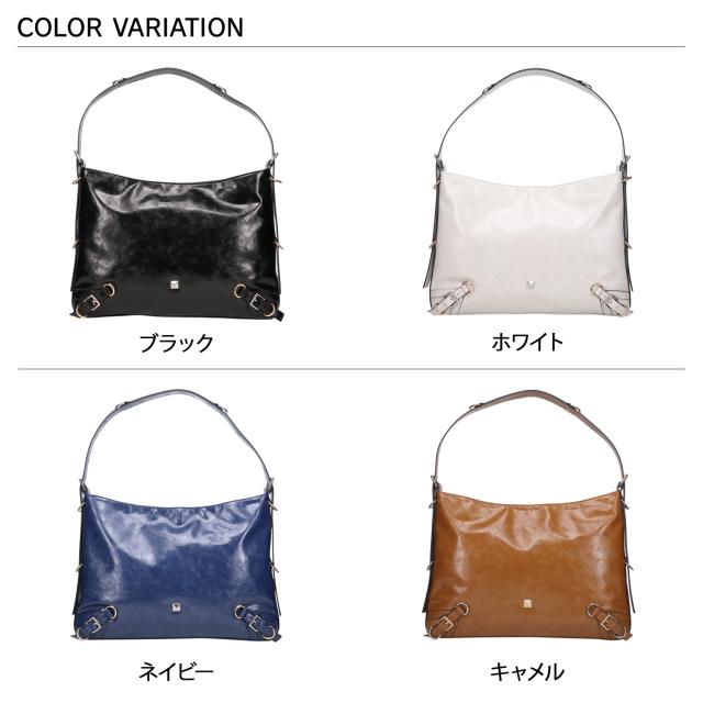 トレンドのY2Kスタイルには欠かせない!ベルト&バックルのデザインがモードで可愛いラージサイズの高見えショルダーバッグです!アクセサリーのような感覚でスタイリングが華やぐ普段のコーデにプラスするだけで旬なスタイルが完成します★A4サイズは勿論、厚みのある荷物もしっかりと収納できる大容量。PC(13インチ)収納可能で、通勤用としてもお使いいただけます。書類を入れてもかっちりしすぎない雰囲気が余裕のあるコーディネートを演出してくれます。500mlのペットボトル、長財布、スマートフォンを入れてもゆとりのある広々としたコンパートメント。ベルトも微調節可能なので肩掛けだけではなく、クロスボディバッグのように短いショルダーにも。