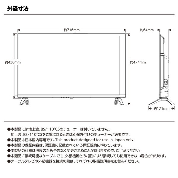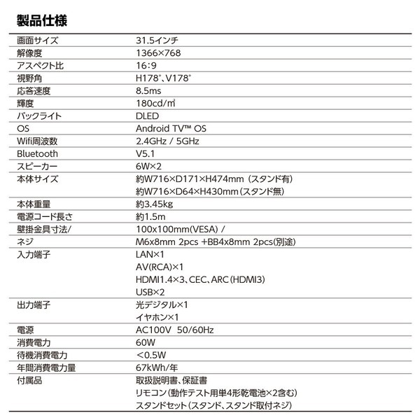 もう、チャンネル争いは終わり。好きな動画を、好きな時に、好きなだけ。 テレビはネットで楽しむ時代に突入。 チューナーレス&Android TV? OS搭載で、リビングがあなた専用のシアター空間に生まれ変わる! \32V型ハイビジョンチューナーレススマートTVのここがポイント/ 豊富な動画コンテンツ NetflixやYouTubeなど、様々な動画配信サービスを手軽に楽しめます。 Android TV OS搭載 Google Playストアから好きなアプリをダウンロードして、自分好みにカスタマイズできます。 高画質ハイビジョン 美しい映像で、映画やゲームをより一層楽しめます。 豊富な接続端子 HDMIやUSBなど、様々な機器を接続して、テレビの可能性を広げます。 32インチの革新、ここにあり! ■Google TV搭載 ? あなた好みに進化するスマートTV Netflix、YouTube、U-NEXT、Amazonプライムビデオ… もうチャンネルを探す必要なし。見たいコンテンツが、一瞬で見つかる! Googleアシスタント対応で、音声操作もラクラク。 ■ちょうどいい"32インチ ? どこでもフィットする万能サイズ ・一人暮らしのリビングにも ・寝室でのくつろぎ時間にも ・ゲームやPCモニターとしても スリムなデザイン&軽量設計で、どこでも快適に使える。 ■Android TV? OS搭載 ? "スマホの自由"をテレビで! Google Playストアから、アプリを自由にダウンロード。 動画、ゲーム、ニュース、SNS…あなただけのTVライフをデザインできる! ■HDMI×3 & USB×2 ? あらゆるデバイスとつながる ・PCやゲーム機をつなげて、低遅延で快適プレイ! ・ゲーム実況や映画鑑賞も、なめらか&クリアな映像美 ・外付けHDDで録画やデータ管理も自由自在 ■ゲームに最適なスペックをチェック! 「普通のテレビでは満足できない」そんなゲーマーのために、このテレビは設計された。 ・応答速度 8.5ms ? FPSやアクションゲームもラグを感じさせない! ・解像度 1366×768 ? HDクオリティで、なめらかな映像体験 ・リフレッシュレート 60Hz ? 映像のチラつきを抑え、スムーズな動きを実現 ・広視野角 178°(H/V) ? どこから見ても美しい画面 低遅延&スムーズな映像で、ゲームの世界に没入できる! ■映像&音質のクオリティを深掘り! 「DLEDバックライトが生み出す、リアルな映像美。」 従来のエッジ型LEDと比べ、画面全体を均一に照らし、コントラストの強い映像を実現。 暗いシーンの黒の深み、明るいシーンの鮮やかさが際立ち、まるで映画館のような迫力を楽しめる。 さらに、6W×2のステレオスピーカー搭載! ・映画のセリフが聞き取りやすいクリアな音質 ・低音も響くバランスの取れたサウンド ・Bluetooth5.1対応で、ワイヤレススピーカーとの接続も可能 映像×音響の相乗効果で、エンタメ体験が劇的に進化する! ■チューナーレステレビのメリット&注意点 「地上波テレビ、もう必要?」 このテレビは"チューナーレス"。つまり、地上波・BS・CSは視聴不可。 けれど、それがこのテレビの最大の強みでもある! ・テレビ番組の時間に縛られない → 好きな時に好きな動画が見られる ・シンプルな設計でコストダウン → 地デジチューナー不要で価格も抑えめ ・地デジの映らない場所でも活躍 → ネット環境さえあればどこでもOK! ※でも注意! ・地上波やBS・CS放送を見たい場合、別途チューナーが必要。 ・インターネット環境が必須なので、WiFi環境が整っていることを確認! ■こんなシーンで大活躍! ・リビングで映画館体験 家族みんなで、大画面&迫力サウンドの映画ナイト! テレビ番組に縛られず、自分たちの好きなコンテンツを自由に選べる。 ・寝室でリラックス視聴 ベッドに寝転がりながら、YouTubeやNetflixでまったり。 疲れた夜も、好きな動画でリフレッシュ! ・ゲームモニターとしても最高 低遅延&なめらかな映像で、FPSやRPGも没入感MAX! HDMI×3だから、PC・ゲーム機・スピーカーの接続もスムーズ。 ・ワイヤレスでサクッとWEB会議 PCモニターとしても使えるから、在宅ワークやオンライン授業にも最適。 Bluetoothスピーカーと連携すれば、クリアな音声で快適コミュニケーション。 ■こんな人にオススメ! ・テレビはもう見ない。でも、大画面で動画を楽しみたい! ・ゲームや映画を、迫力ある映像で堪能したい! ・PCモニターとしても使えて、省スペースでスッキリさせたい! ・スマホのように、アプリを自由にダウンロードして使いたい! ■進化したテレビを、今こそ手に入れろ! テレビ番組に縛られない、新時代のスマートTV。 「見たい!」がすぐ叶う、ストレスフリーな映像体験をあなたに。 ・家でも、寝室でも、ゲームでも、万能な32インチモデル。 ・今すぐ、新しいエンタメの世界へ飛び込もう! このテレビを導入すれば、ストリーミング動画やゲームを存分に楽しめる快適なエンタメ環境を手に入れられます。 興味がある方は、ぜひチェックしてみてください! 【商品特徴・キーワード】 32型 スマートテレビ チューナーレス テレビ Android TV 32インチ ハイビジョン スマートテレビ Netflix対応 テレビ YouTube対応 テレビ 32インチ モニター 【サイズ】 ■本