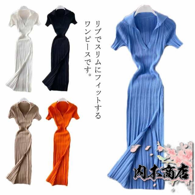 タイトリブワンピース ロングワンピース Vネック 半袖 ニットワンピース ロング フロントスリット タイト ひざたけ 膝丈 秋冬 春秋 リブニット セクシー タイトワンピース 送料無料