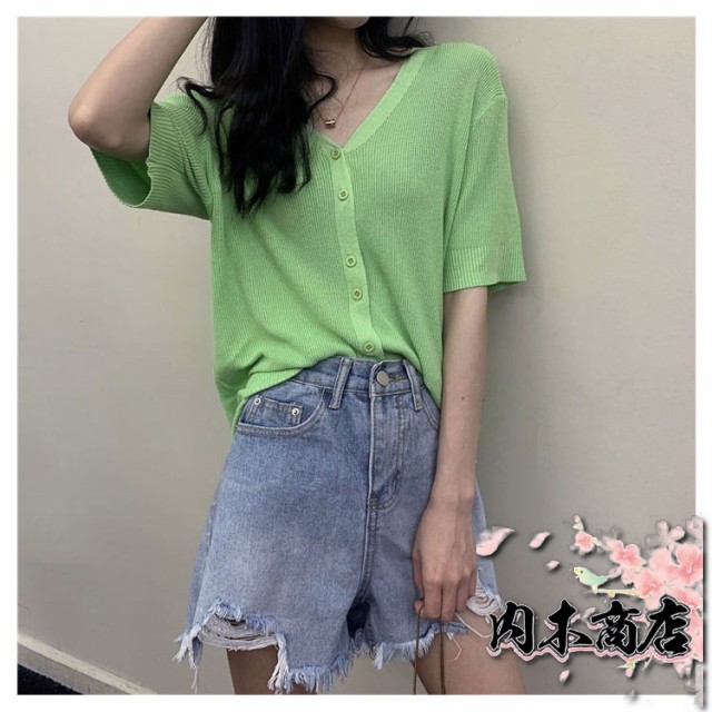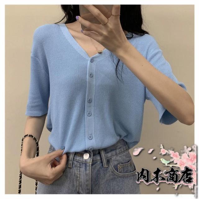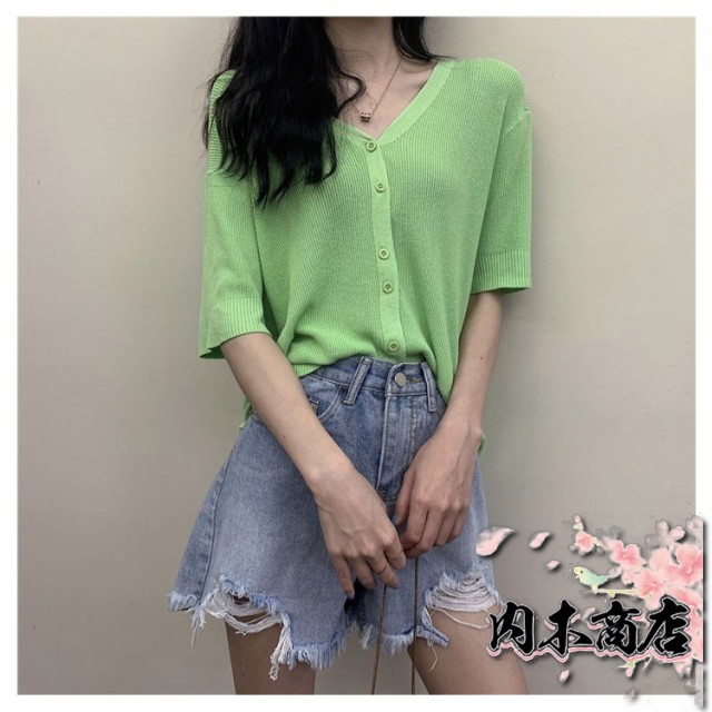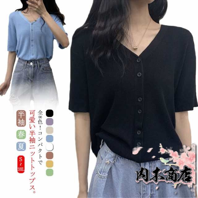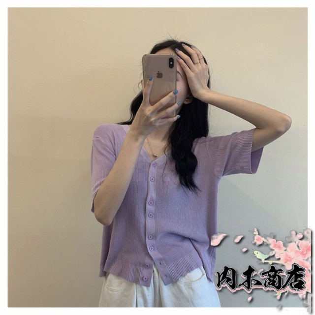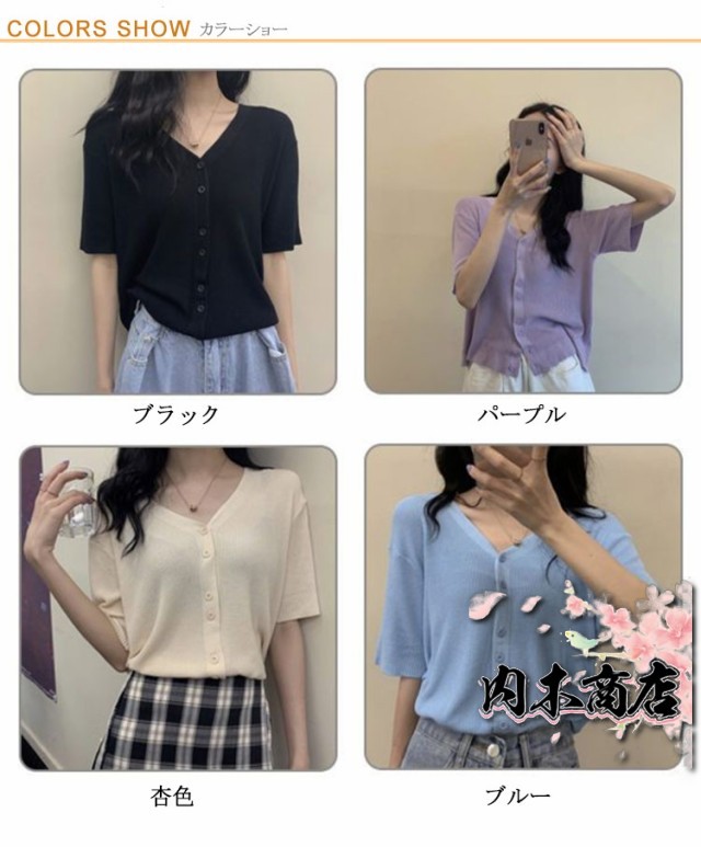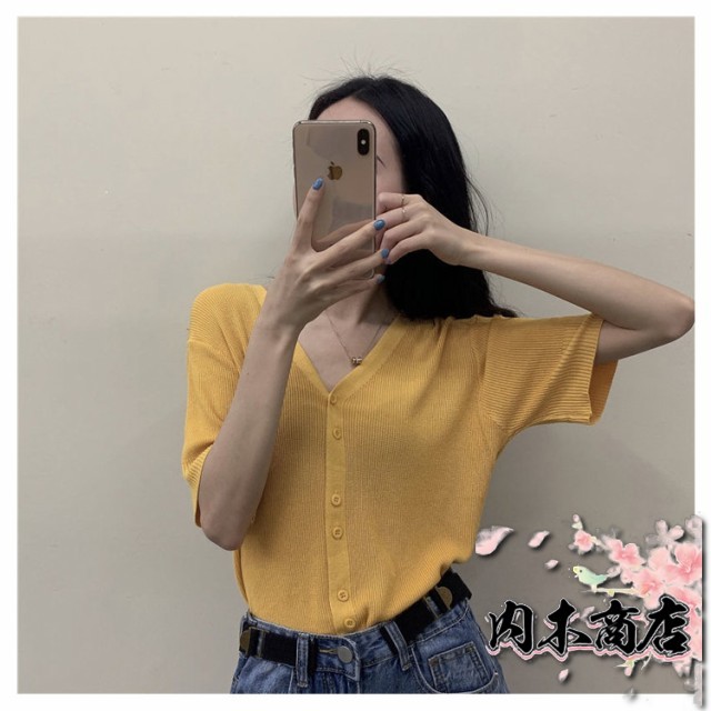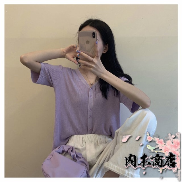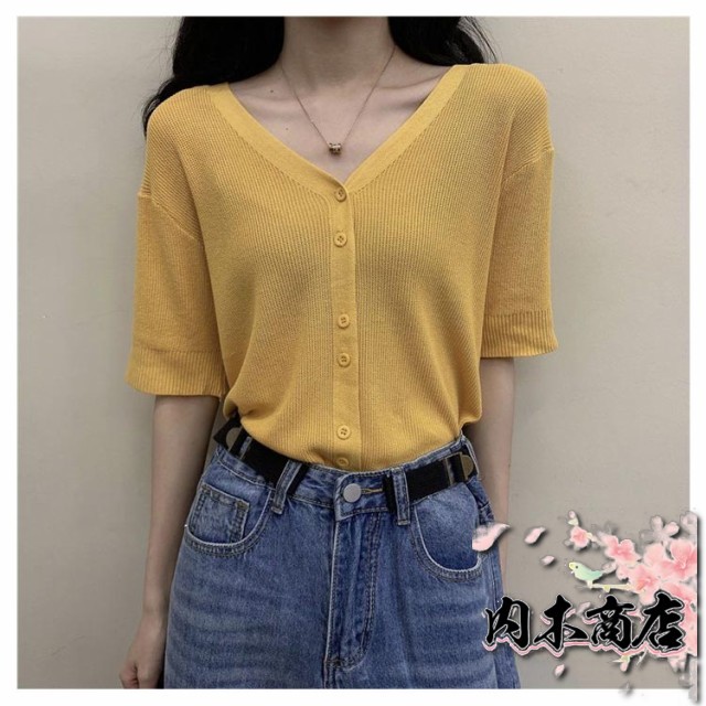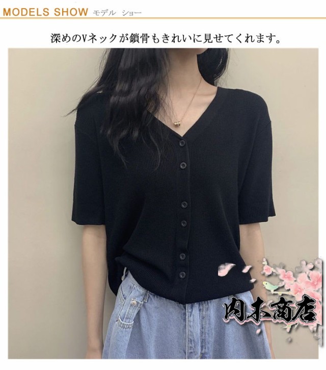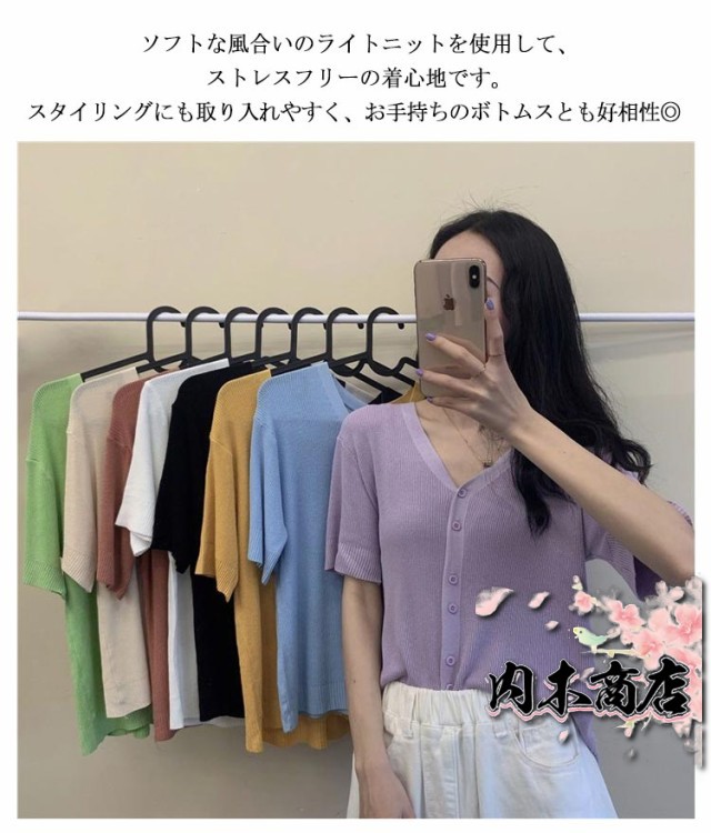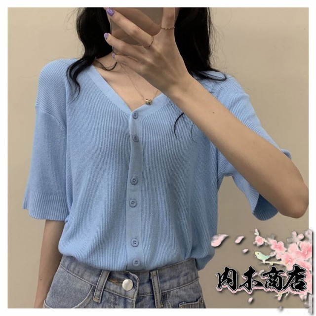 | 全8色!コンパクトで可愛い半袖ニットトップス。 深めのVネックが鎖骨もきれいに見せてくれます。 フロントボタン式になります。 ショート丈だから脚長効果も期待できます。 ソフトな風合いのライトニットを使用して、ストレスフリーの着心地です。 スタイリングにも取り入れやすく、お手持ちのボトムスとも好相性◎ | |