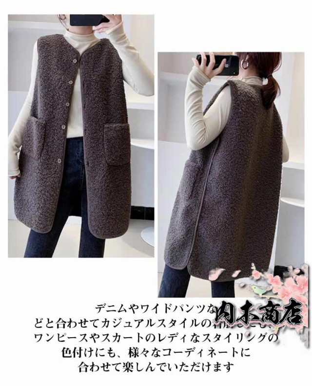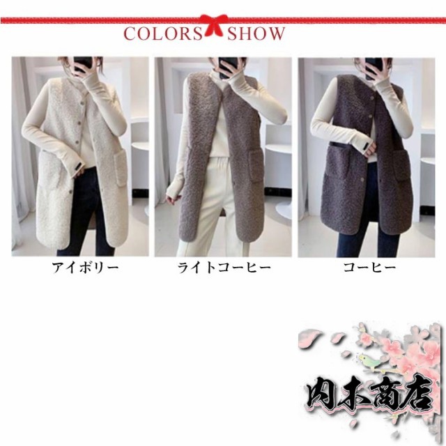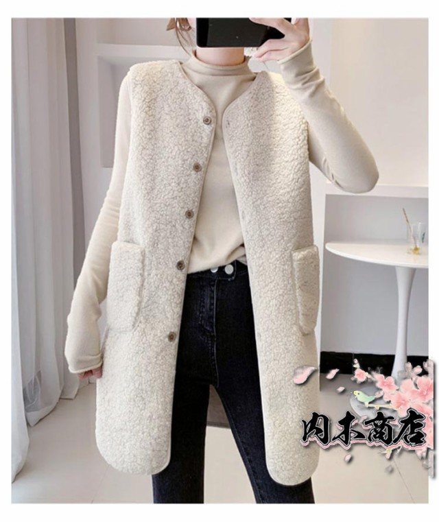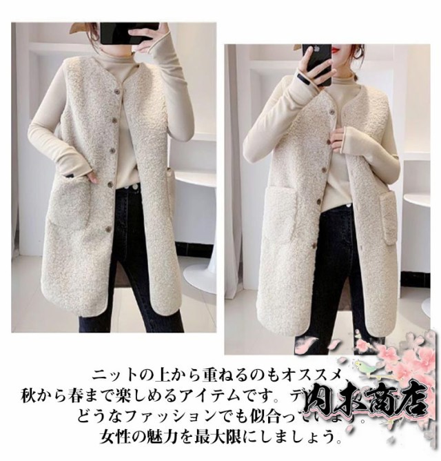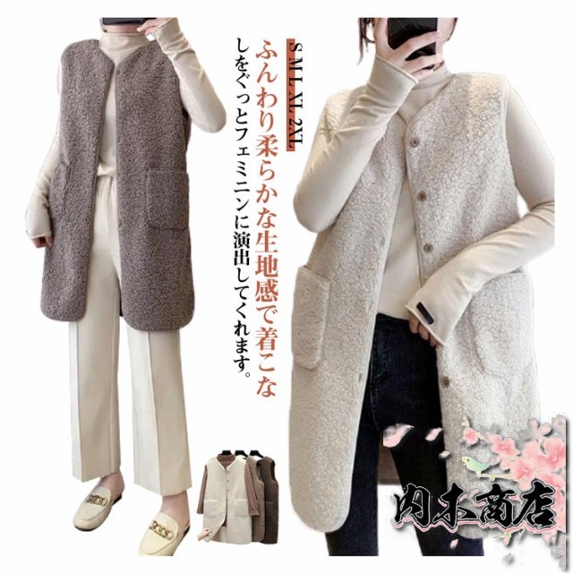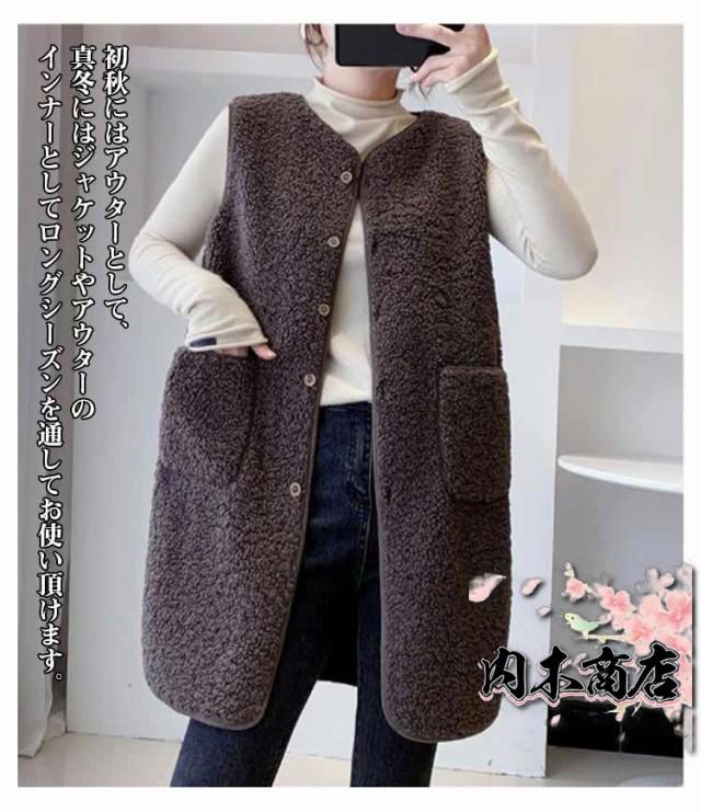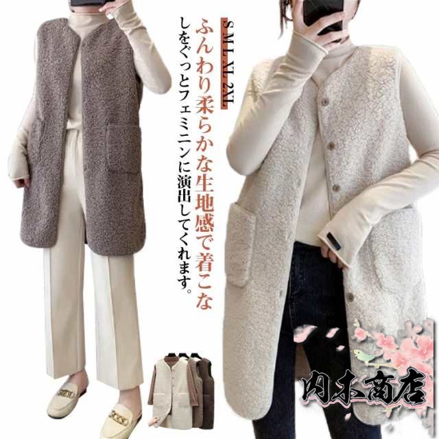 体型カバー レディース ベスト ボアベスト 女性 アウター 上着 ロングベスト ボアジャケット ノースリーブ ボア ジャケット 羽織り 袖なし ロング丈 前ボタン ポケット モコモコ あったか 暖かい 無地 お出かけ 普段使い 婦人用 S M L XL