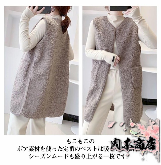 ベスト ボアベスト レディース 女性 アウター 上着 ロングベスト ボアジャケット ノースリーブ ボア アウター ジャケット 体型カバー 羽織り 袖なし ロング丈 ボア 前ボタン ポケット モコモコ あったか 暖かい 無地 お出かけ 普段使い 婦人用 送料無料 S M L XL 2XL