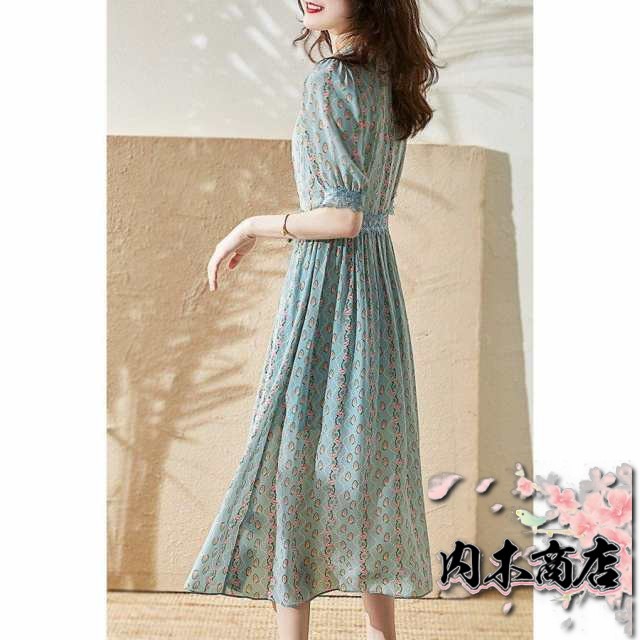 ワンピース レディース 40代 マキシワンピース 春夏新作 半袖ワンピース 花柄 レースVネック パフスリーブ シフォンスカートオシャレ韓国