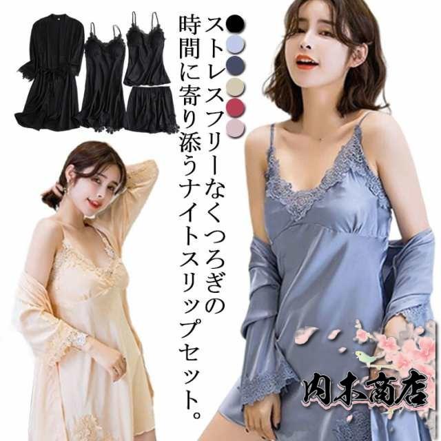 ランジェリー 上下セット ルームウェア 4点セット レディース サテン パジャマ カップ付き キャミソール ペチパン ワンピース ロングガウン セット レース 刺繍 花柄 セクシー ナイトウェア 寝間着 可愛い 部屋着 薄手 春 夏 送料無料