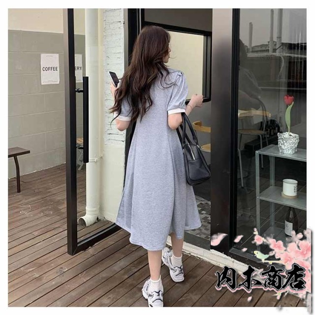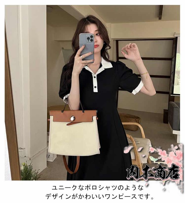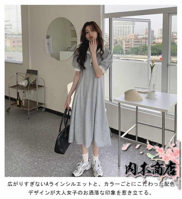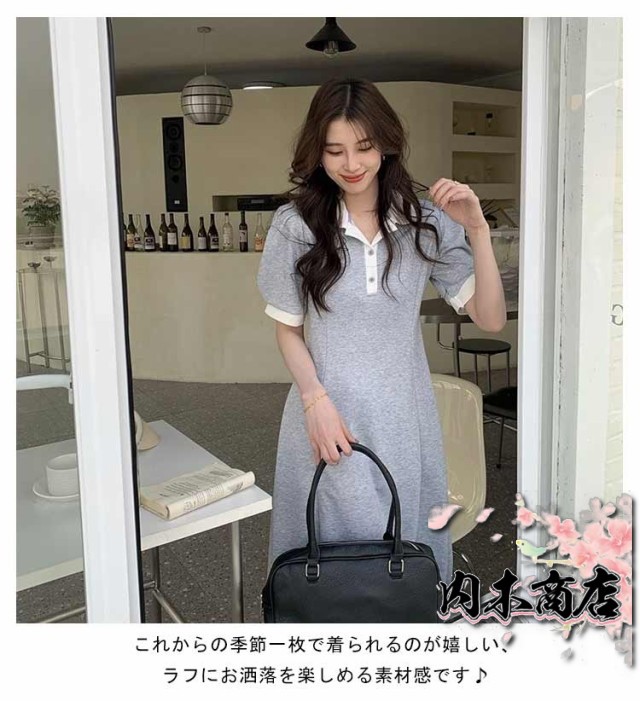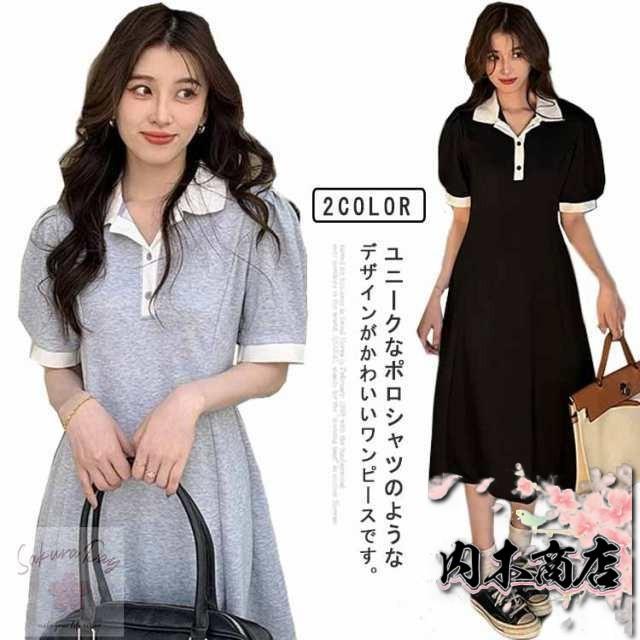 ポロワンピース ポロシャツ 半袖 レディース 夏 ワンピース ポロ衿 配色 大きいサイズ ミモレ丈 パフスリーブ スポーティー ポロシャツ風 配色 カットソー Aライン カジュアル 襟付き