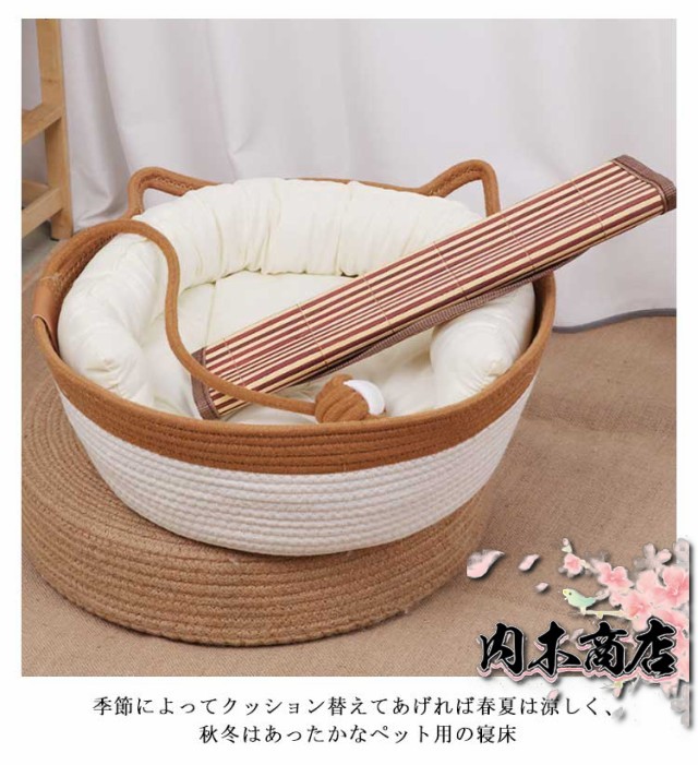 ペットベッド 綿 コットン ペットベッド 猫 犬 犬 夏用 猫耳デザイン 4点セット ペットベッド ひんやり 犬 カゴ ちぐら型 籐編み マット バスケット クッション付き 爪とぎ ペット ベッド 円形 丸型 ペットハウス 室内用 猫 犬