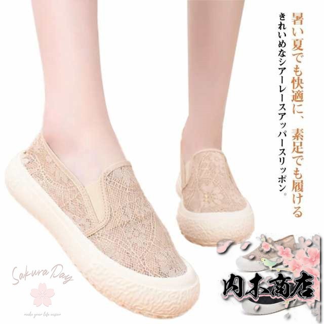 レース メッシュシューズ レース 紐なし スリッポン スリッポンスニーカー 履きやすい ローカット フラットシューズ 可愛い オフィス ベージュ ブラック ぺたんこ おしゃれ 通勤 春夏 レディース