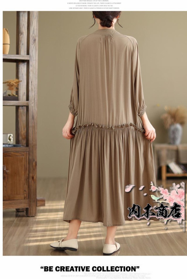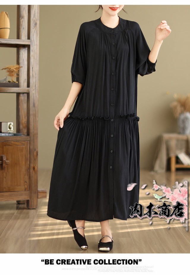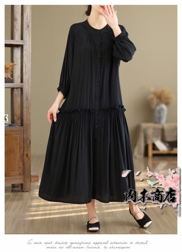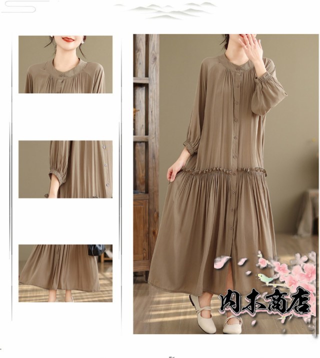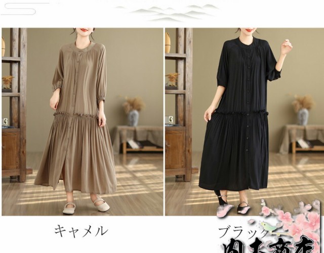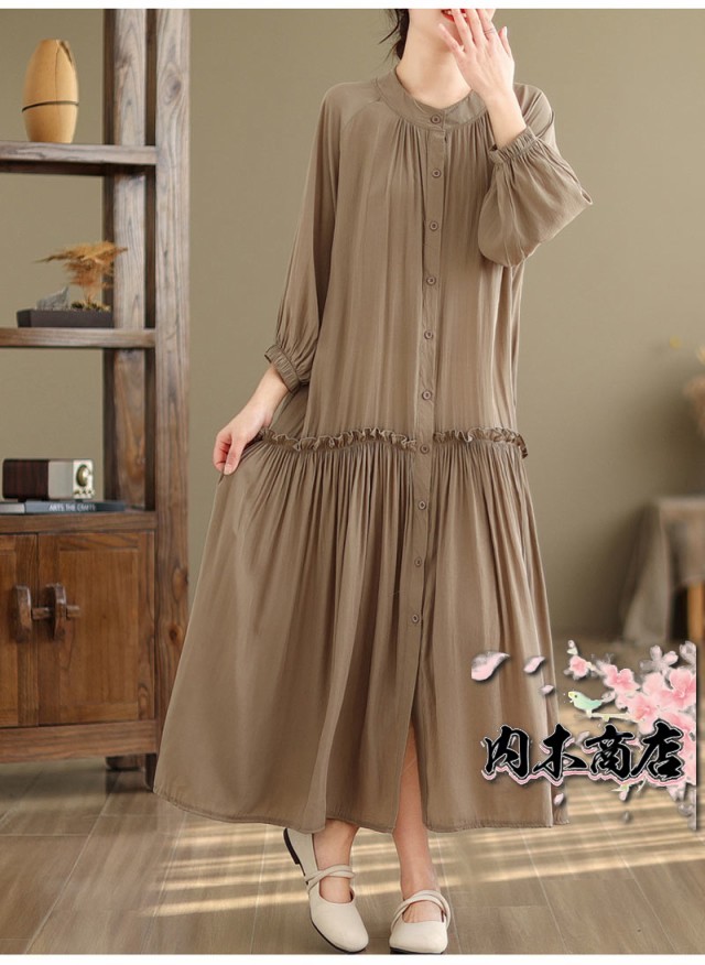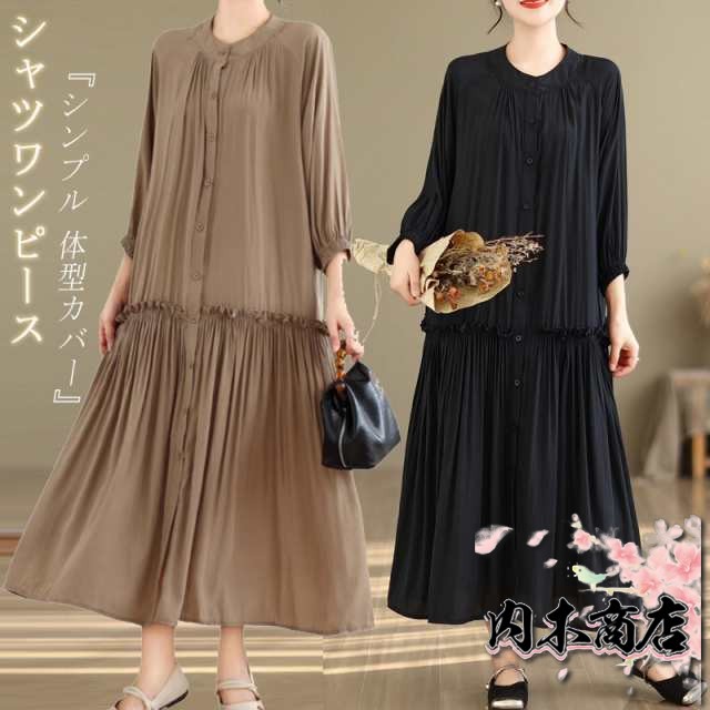 体型カバー 通勤シャツ ワンピース シャツワンピース 無地 ギャザーワンピース 長袖ワンピース 春 丸首 大きいサイズ ロングワンピース バルーン袖 9分袖 ゆったり ロングワンピ 無地ワンピース 春秋 立ち襟 チュニック フレア お洒落 マキシ丈 夏