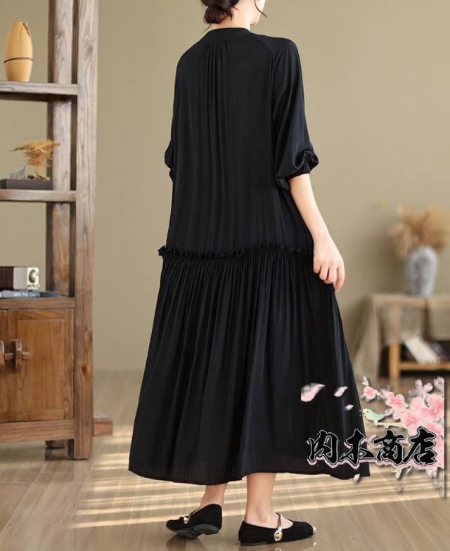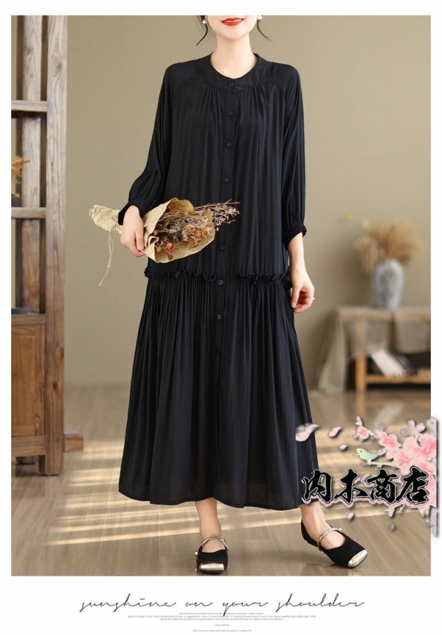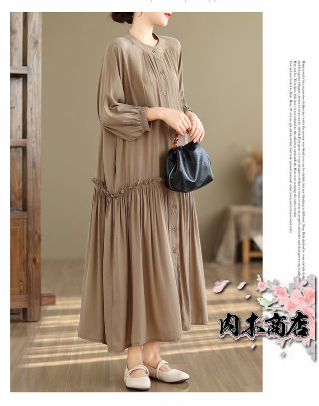 ワンピース シャツワンピース 無地 ギャザーワンピース 長袖ワンピース 丸首 大きいサイズ ロングワンピース バルーン袖 9分袖 ゆったり ロングワンピ 無地ワンピース 秋 立ち襟 チュニック 体型カバー フレア お洒落 通勤シャツ マキシ丈 秋 夏 秋物 送料無料
