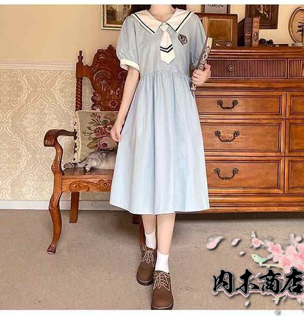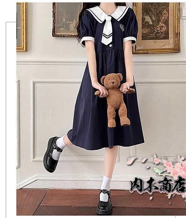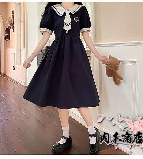 ワンピース ビッグカラー セーラー風 胸元リボン 半袖 夏用 夏服 かわいい レディース 中学生 デコ襟 大きいサ