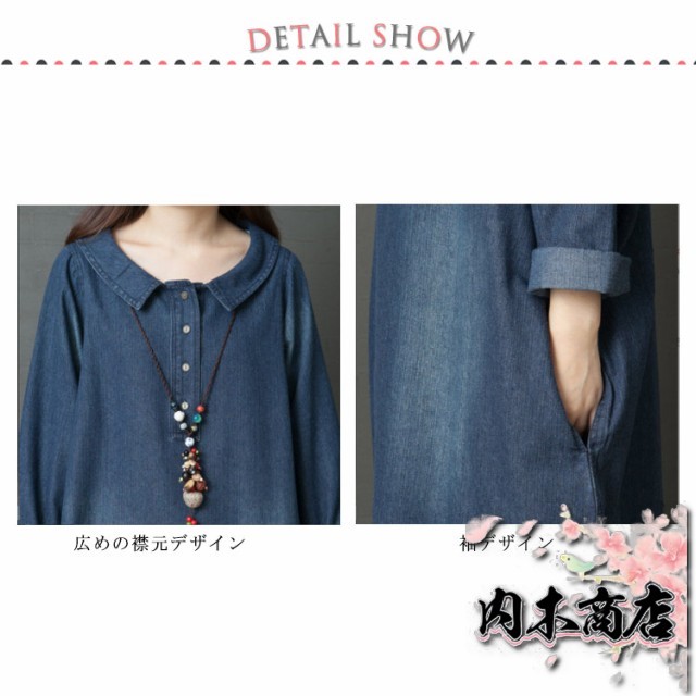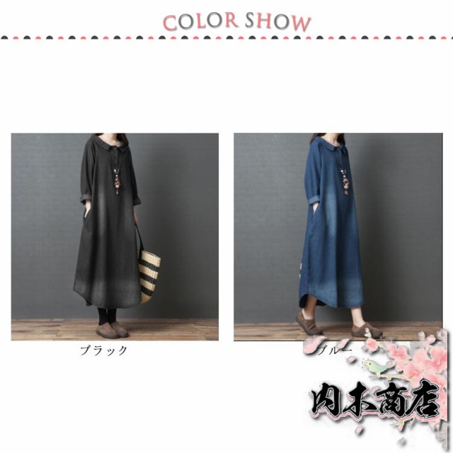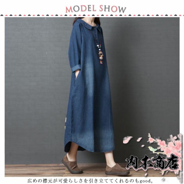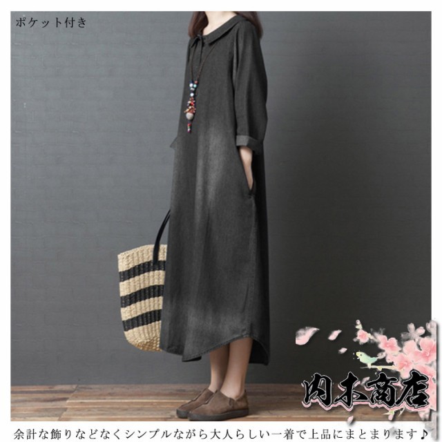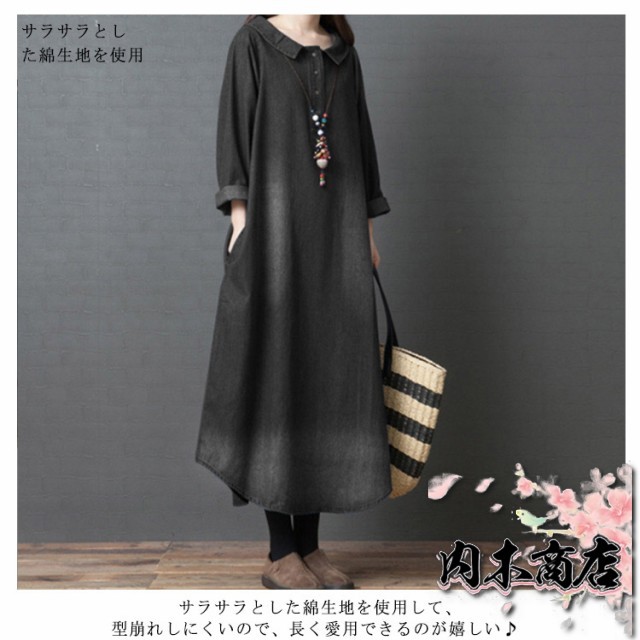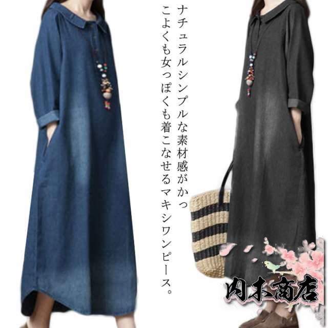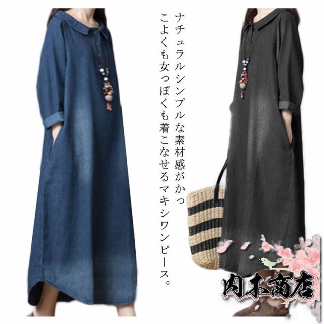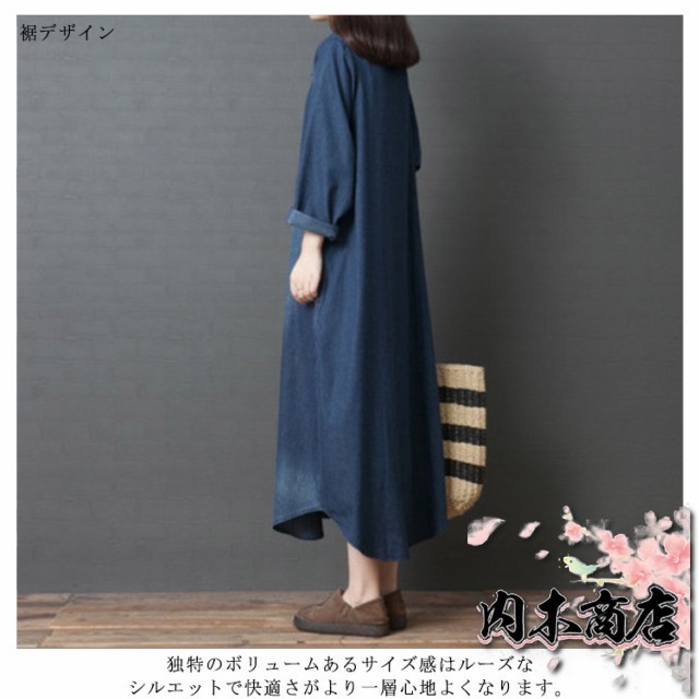 長袖 デニム ワンピース マキシワンピース 綿 春 夏 秋 レディース ロングワンピース チュニック 大人 ゆったり 大きいサイズ 体型カバー ナチュラル シンプル 無地 着痩せ 普段着 おしゃれ
