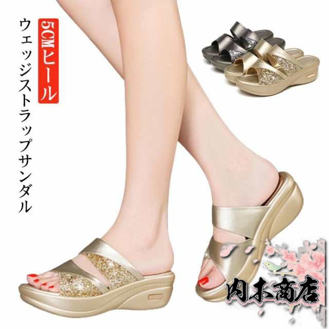 サンダル レディース ウェッジソール 厚底 ダブルベルト スパンコール ラインストーン キラキラ 春 夏 ミュール つっかけ 歩きやすい 幅