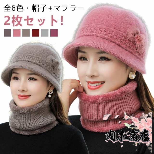 レディース 防寒 帽子 秋冬 マフラー 帽子+マフラー 2枚セット ニットキャップ ネックウォーマー 防風 暖かい おばあちゃん ハット ニット帽 リボン かわいい きれいめ 上品 柔らかい あったか 婦人 毛糸帽子 お年寄り 高齢者 シニア ギフト