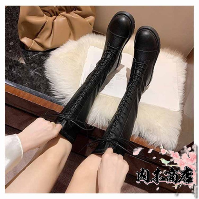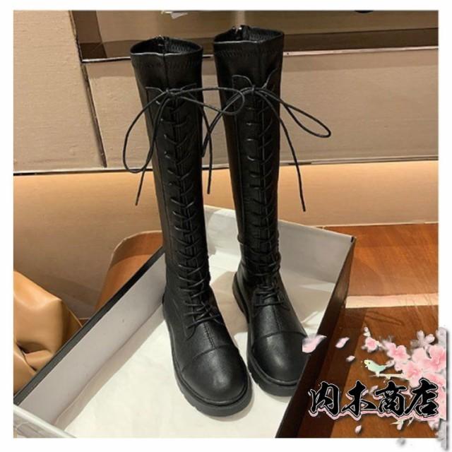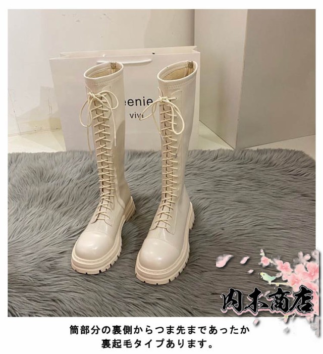 ロングブーツ レースアップ 裏起毛と裏起毛なし2タイプ レディース コンバットブーツ バックファスナー フラット底 ラウンドトゥ 編み上げ 細見え 足長効果 春 秋 冬 あたっか 撥水 防水 軽量 pu 革ブーツ 防寒 保温