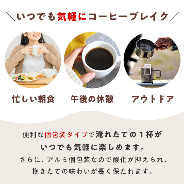 便利な個包装タイプで美味しいコーヒーがすぐできるので、忙しい朝やランチタイムのお供にピッタリ。