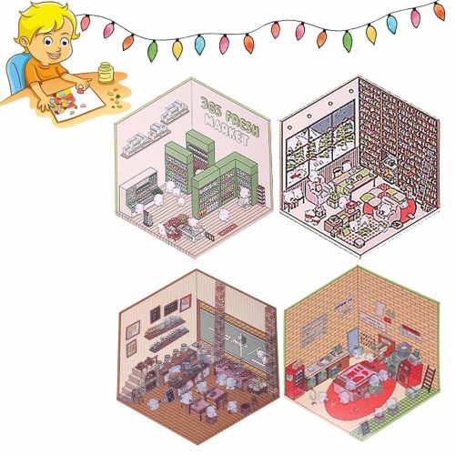 4個3Dハウス ステッカー シーンシール 造景シール 紙ミニチュア模型 紙ドールハウス 紙素材 手帳素材パック 日記帳 DIY 3D ハウスステッカー 立体 韓国系 ニッチ 可愛い シール 趣味(コンビニ、パン屋、ランドリー、書斎)