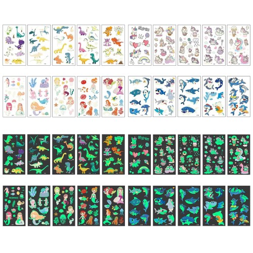 セット:20枚タトゥーシール(蛍光);サイズ:7cmx12cm。 デザイン:恐竜、人魚、サメ、ユニコーンについての様々な柄。ご好きなモチーフを自由に選択できます。 子供の学習補助:子供用シールは、子供の学習意欲を促進するのに最適です。これらのかわいく楽しいドット型 多機能用途子供、男の子、女の子、大人に適しています。身体や、ガラス、タイル、文房具、紙、ステンレス鋼、プラスチック、プレゼントボックス、ケース、車などの滑らかな表面に適用できます。 安全・安心使用でき:高品質ポリエステル素材の紙 、裏面:EVA樹脂接着剤。有害成分不使用の為、安全安心、最高の安全品質および無害材料品質基準適応。