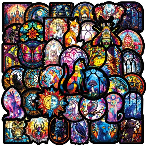 ゴシック調ステンドグラスアートステッカー50枚 子供用水瓶シール、大人の趣味ビニルノートパソコンスケートボード教室シールバッグ青少年女の子男の子学生 (格子模様の窓)