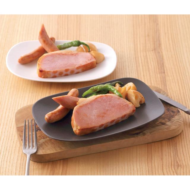 ■商品詳細:サーロインハムステーキ120g×2、粗挽きフランク180g、ポークソーセージ150g