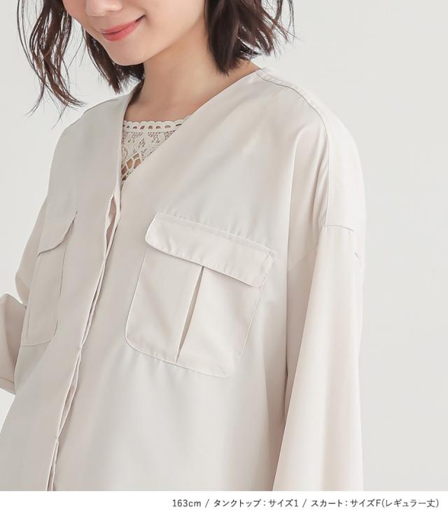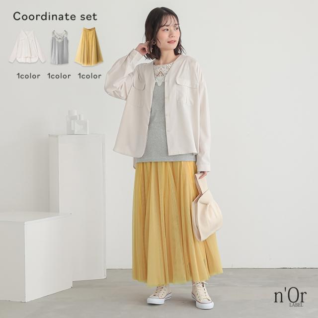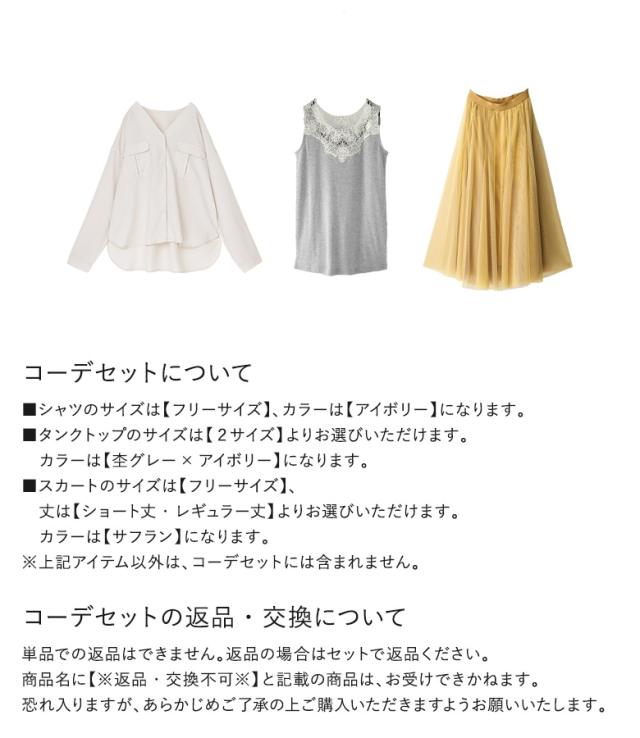 【送料無料】『VネックWポケットシャツ×襟元レースデザインタンク×配色ボリュームチュールスカートコーデ3点SET』【メール便不可】【25】[3点コーデセット 2025 レディース シャツ キャミソール ボトムス スカート]