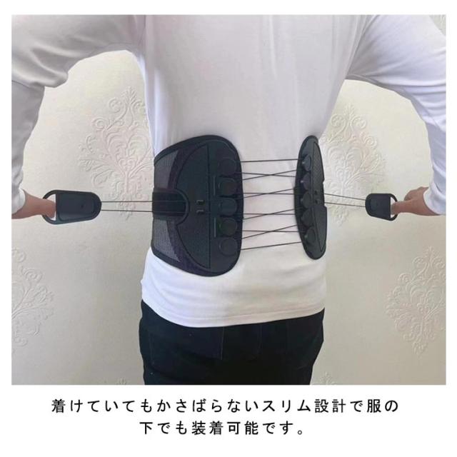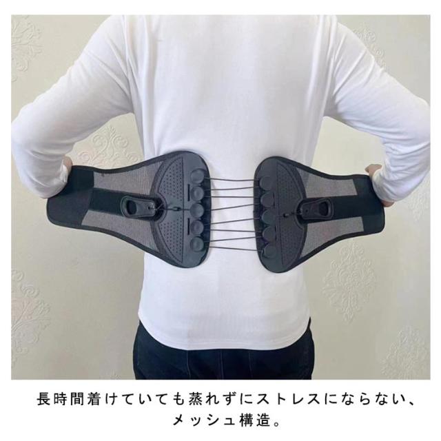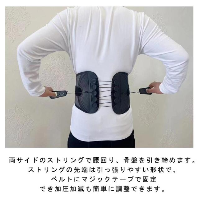 | 両サイドのストリングで腰回り、骨盤を引き締めます。ストリングの先端は引っ張りやすい形状で、ベルトにマジックテープで固定でき加圧加減も簡単に調整できます。 長時間着けていても蒸れずにストレスにならない、メッシュ構造。 着けていてもかさばらないスリム設計で服の下でも装着可能です。 | |