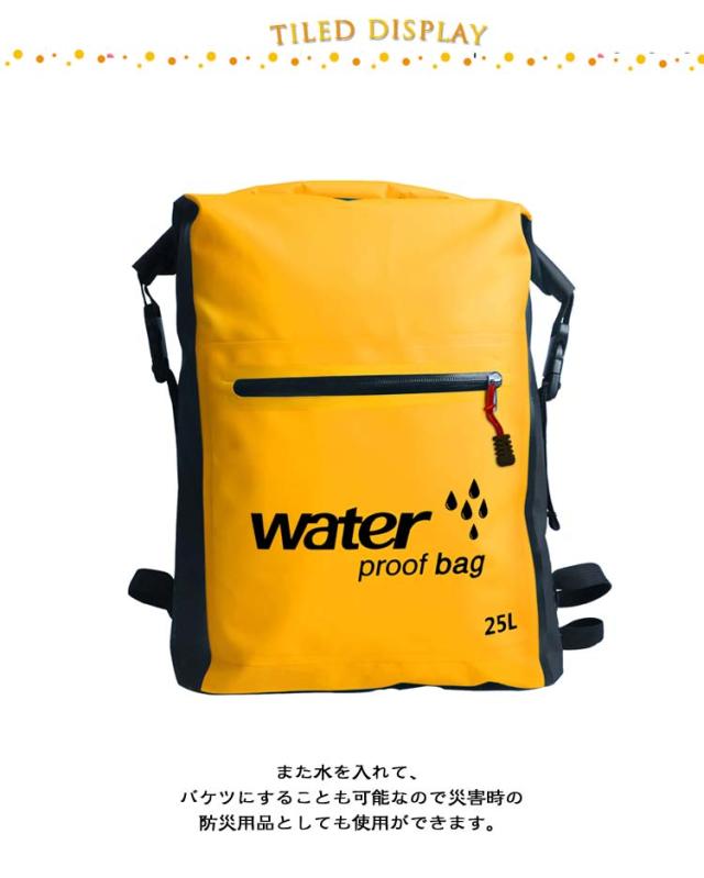 | 海や川などの水辺でのレジャーアクティビティに最適な防水リュックです。 密封性や防水性に優れ、肌触りの良い生地になりました。 開口部を数回折り畳んで、バックルを締めることで、水や砂、汚れから貴重品を守ります。 大きな開口部になっているので荷物の出し入れが簡単です。大容量の25Lサイズで水着、衣類はもちろん、タオルなども一緒に収納可能です。 使用しない時は、折り畳めば持ち運びも可能に!アウトドアでのご使用や旅行として役立ちます。汚れたら水で洗い流せお手入れ簡単です。 また水を入れて、バケツにすることも可能なので災害時の防災用品としても使用ができます。 | |