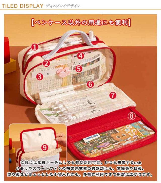 | トレンドの韓国っぽさたっぷりで可愛いペンケース 身中のファスナーを開ければ、マチ付きデザインになり、展開で広がる拡張式。見開き式になるので、中身が見やすく、消しゴムや修正テープなど、小さいものも取り出しやすく便利です。 ? 【たっぷり入る大容量】ペン類が約30〜60本入る大容量デザイン。消しゴム、付箋、ハサミ、定規、メジャー、修正テープなどの小物もたっぷり収容できます。収容数はペンの種類によって異なります。 ? 【ペンが探しやすい】 メインファスナーがぐるりと大きく開くので、必要なものをスマートに取り出すことができ、ファスナーには引き手がついているので開閉しやすくなっています。 ? 【丈夫な素材】 高品質の素材を採用で、耐久性があり、清掃しやすく、耐摩耗性に優れたペンケースですし、筆箱内部の物をちゃんと守ります。 毎日の生活に大活躍! ? 【ペンケース以外の用途にも便利】 女性には化粧ポーチとしても有効活用可能。いつも携帯するusbメモリやスマートフォンの携帯充電器の機器類にも。常備薬や目薬、塗り薬などちょっとした小物入れにも。多様に利用できて用途は広がります。 | |