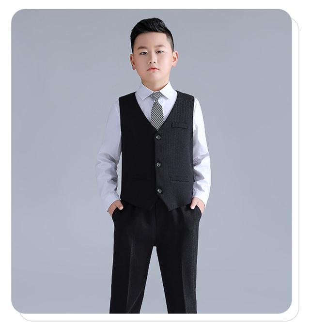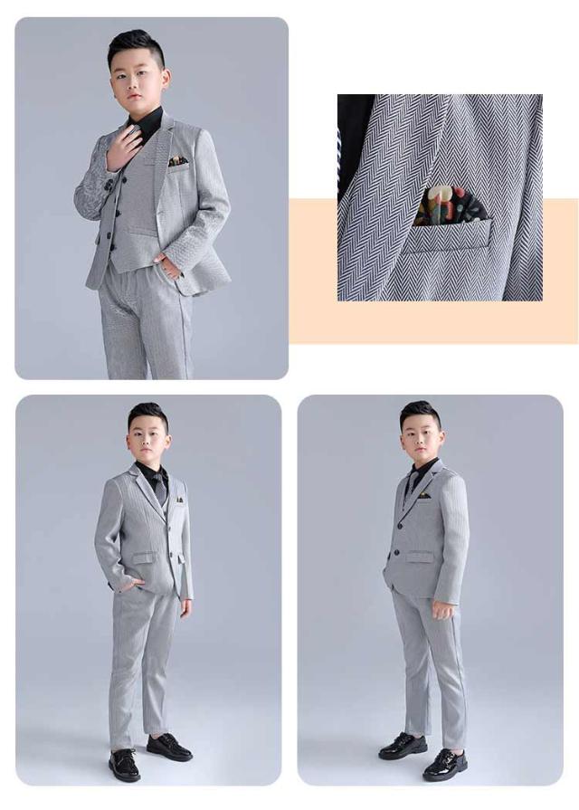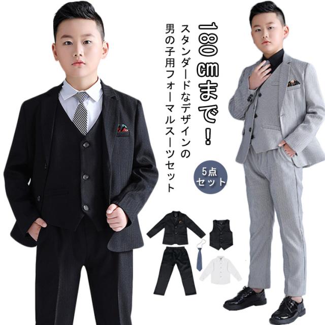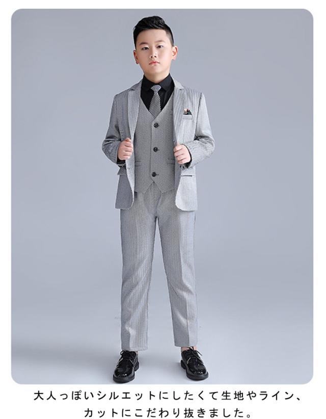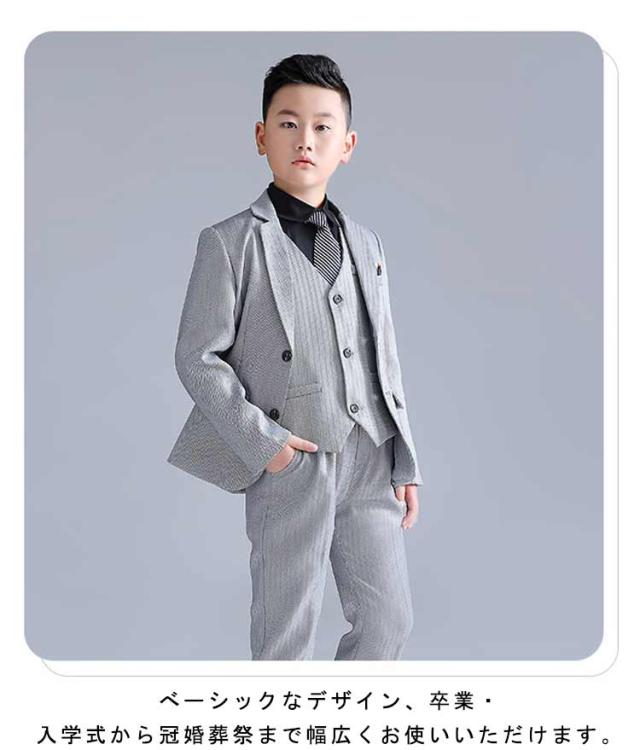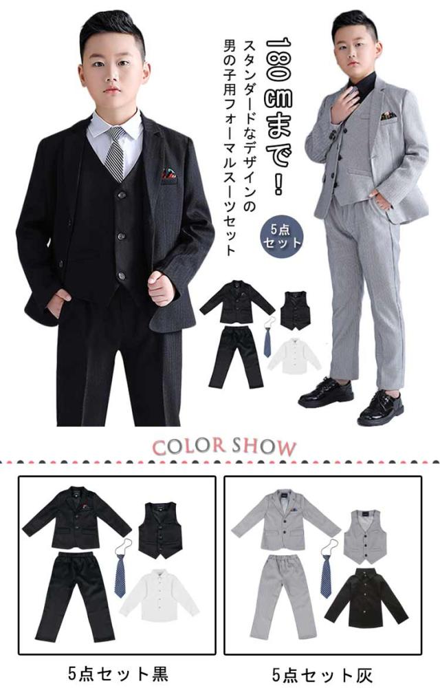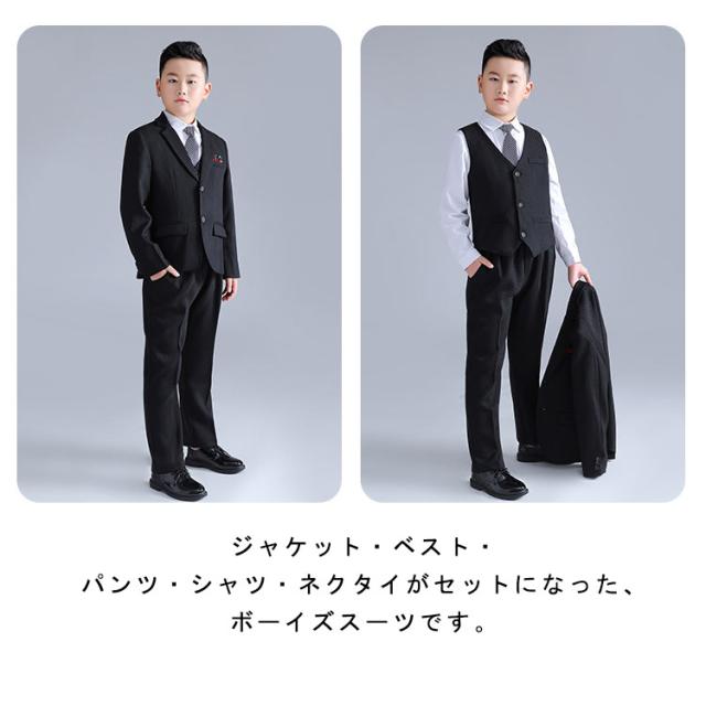 | 180cmまで!スタンダードなデザインの男の子用フォーマルスーツセット ジャケット・ベスト・パンツ・シャツ・ネクタイがセットになった、ボーイズスーツです。 大人っぽいシルエットにしたくて生地やライン、カットにこだわり抜きました。 お手入れ簡単のポリエステル素材を採用するので、型崩れしにくく、美しいシルエットをキープします。 べーシックなデザイン、卒業・入学式から冠婚葬祭まで幅広くお使いいただけます。 | |