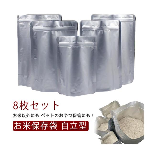 | 8枚セット お米保存袋 自立型 鮮度を保つ三層構造(外層PET、中層アルミニウム、内層ポリエチレン) マチ付きでしっかり自立 お米以外にも!ペットのおやつ保管にも! | |