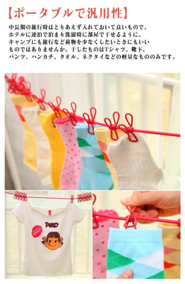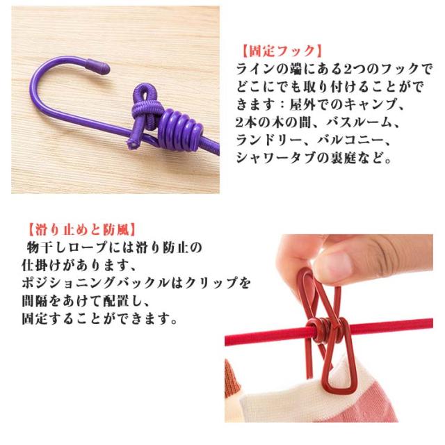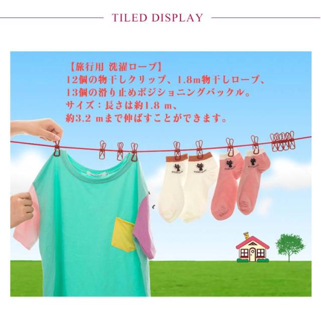 | 【旅行用 洗濯ロープ】12個の物干しクリップ、1.8m物干しロープ、13個の滑り止めポジショニングバックル。 サイズ:長さは約1.8 m、約3.2 mまで伸ばすことができます。 【滑り止めと防風】 物干しロープには滑り防止の仕掛けがあります、ポジショニングバックルはクリップを間隔をあけて配置し、固定することができます。 【ポータブルで汎用性】 中長期の旅行時はとりあえず入れておいて良いもので、ホテルに連泊で泊まり洗濯時に部屋で干せるように、キャンプにも旅行など荷物を少なくしたいときにもいいものではありませんか。干したものはTシャツ、靴下、パンツ、ハンカチ、タオル、ネクタイなどの軽量なもののみです。 【固定フック】 ラインの端にある2つのフックでどこにでも取り付けることができます:屋外でのキャンプ、2本の木の間、バスルーム、ランドリー、バルコニー、シャワータブの裏庭など。 【雨勝ち対策】 雨が多い時期には干せずに洗濯物がたまります。そんな時にこの物干しロープがあると便利! | |