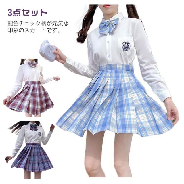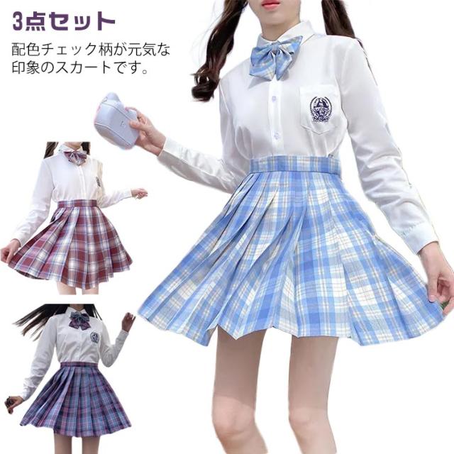 制服 3点セット 中学校 チェック柄 スカート 白シャツ プリーツスカート 女子高生 スクール 中学生 学生制服 上下セット 長袖シャツ 蝶ネクタイ付き スクール制服 スクールシャツ 制服 高校生 制服 キッズ 女の子 文化祭 発表会