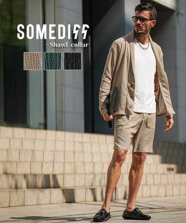 SOMEDIFF(サムディフ)『楊柳ショールカーデセットアップ』【サマーリゾートショールセットアップ】■Design/デザイン軽やかに、品よく。春夏のセットアップスタイル。洗練された大人のリラックス感を纏う、サマーリゾートシャツ&ショーツセットアップ。軽やかな楊柳素材が生み出すナチュラルな風合いと、程よくゆとりのあるシルエットが、抜け感のある上品なスタイルを演出する。シャツはショールカラー×フロントボタン仕様で、羽織るだけでこなれた印象に。ショーツはタイトなウエストとドローコード付きで、美しいシルエットと快適な穿き心地を両立。カラーは、都会的なブラック、品のあるベージュ、そしてリゾートに映えるグリーン。