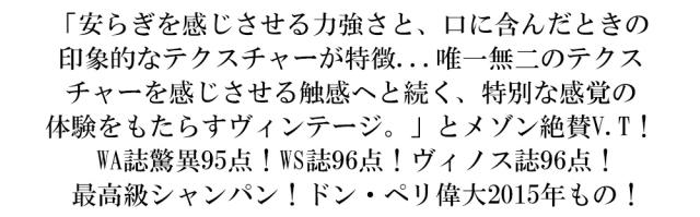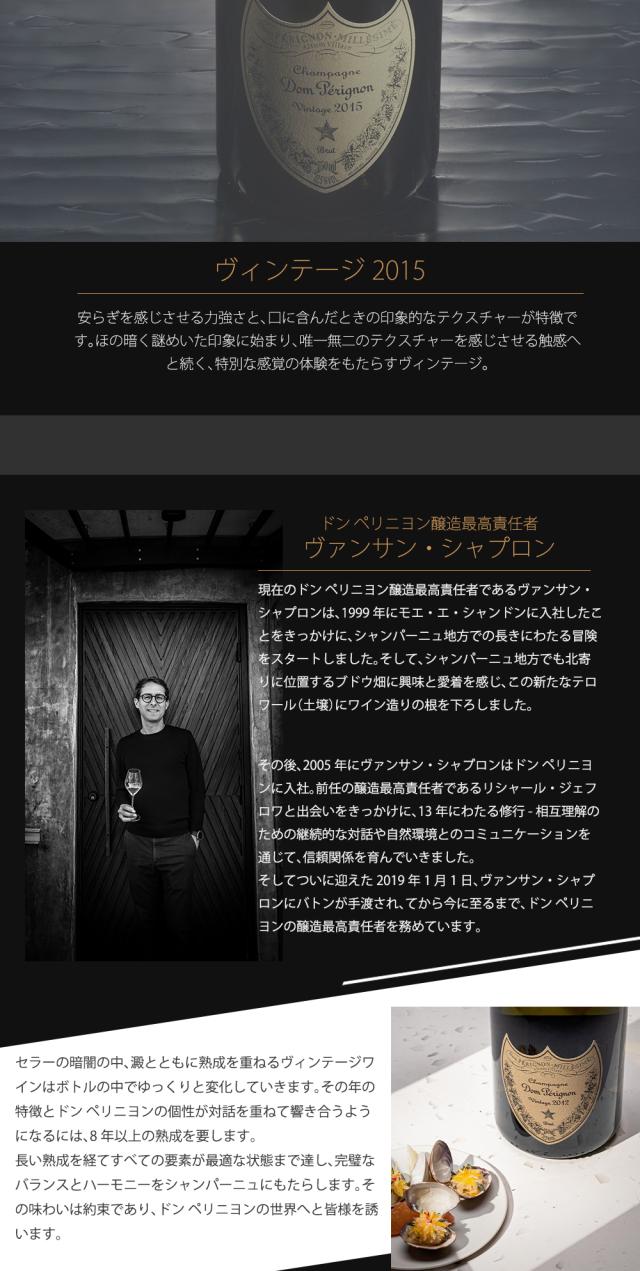 「安らぎを感じさせる力強さと、口に含んだときの 印象的なテクスチャーが特徴...唯一無二のテクス チャーを感じさせる触感へと続く、特別な感覚の 体験をもたらすヴィンテージ。」とメゾン絶賛V.T WA誌驚異95点!WS誌96点!ヴィノス誌96点! 最高級シャンパン!ドン・ペリ偉大2015年もの!