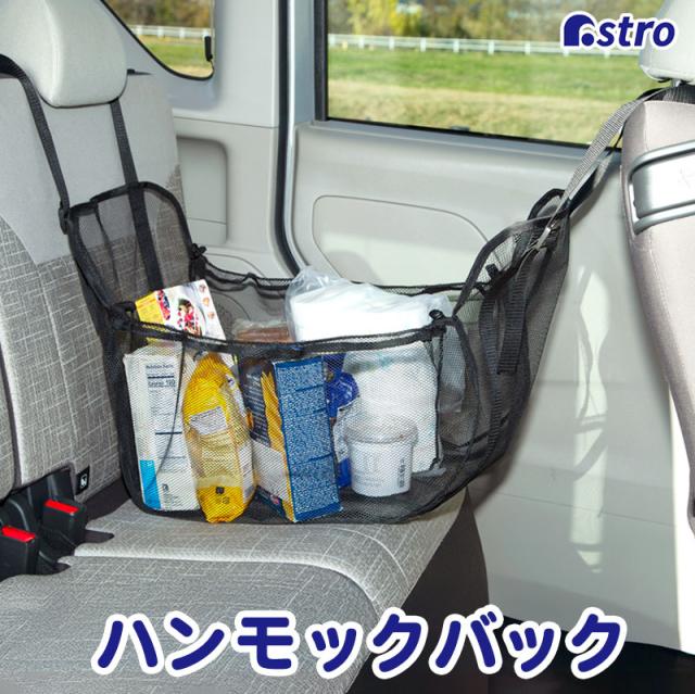 車用ハンモック型収納ネット ブラック 車内 ハンモックバッグ 荷物入れ 荷崩れ防止 後部座席 荷物置き場 買い物袋固定 カバン入れ 中身が見える メッシュネット 車載 収納バッグ 荷物の散乱を防ぐ 落下防止 スリムにもなる 折りたためる 車内空間を有効活用 アストロ 607-63