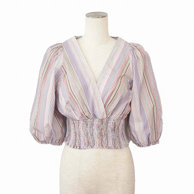 【中古】ザラ ZARA シャツ ブラウス ドルマンスリーブ シャーリング ショート丈 ストライプ XS マルチカラー レディース