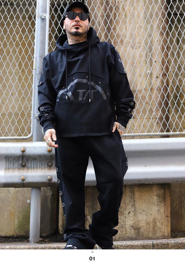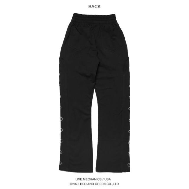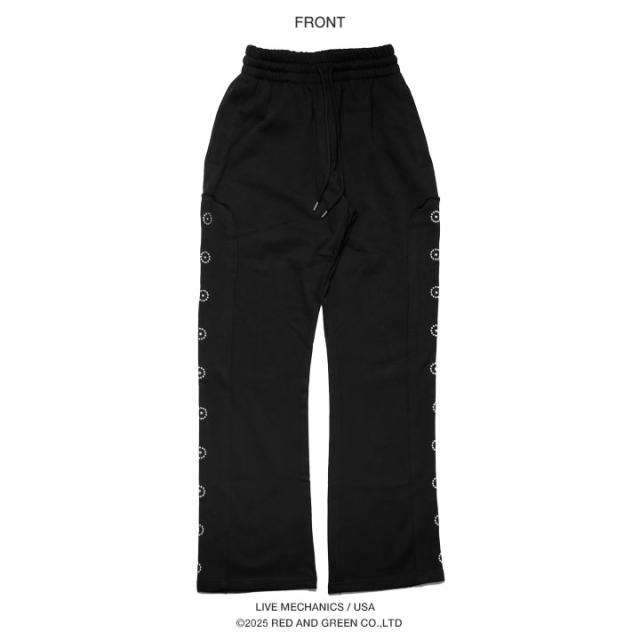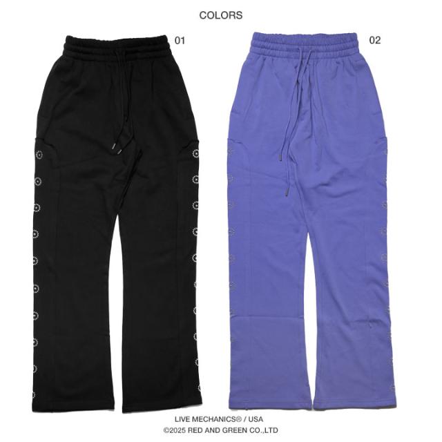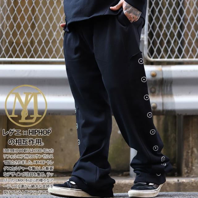 LIVE MECHANICS スウェットパンツ フレアパンツ ベルボトム フレアー モノトーン スポーツ メンズ 黒 紫 大きいサイズ ライブメカニクス ロングパンツ スタッズ あて布 b系 ヒップホップ ファッション ストリート系 ブランド 2025春夏 新作 LMSP103