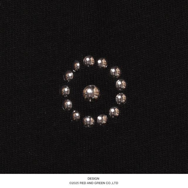 両サイドには、スタッズでサークルを模った反復デザインをオン。生地をあてがったあて布加工もポイント。