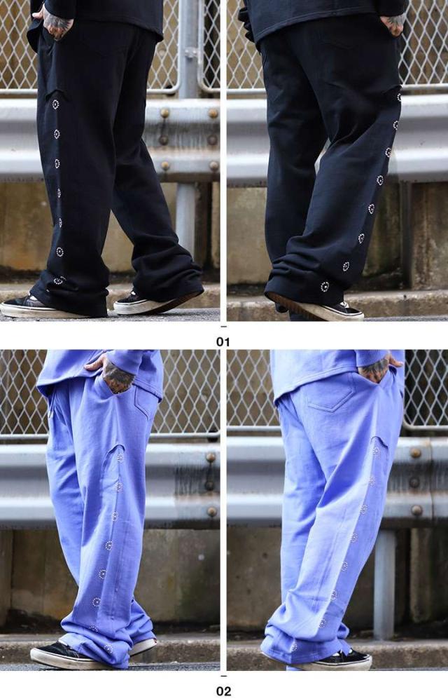 両サイドにスタッズをドロップしたフレアタイプのスウェットロングパンツ。