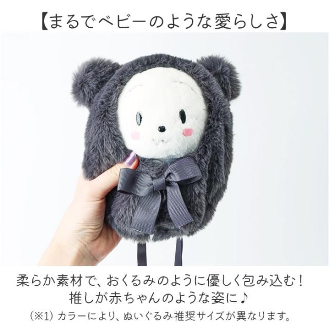 | 商品説明 | 【推しのぬいぐるみを可愛く持ち歩き】 ・すっぽり収めて、可愛さアップ♪一緒にお出掛けできる「おくるみぬい2WAYショルダー」。 【まるでベビーのような愛らしさ】 柔らか素材で、おくるみのように優しく包み込む!推しが赤ちゃんのような姿に♪ (※1)カラーにより、ぬいぐるみ推奨サイズが異なります。 【お好みに合わせてスタイルチェンジ】 ・長いストラップを調節して斜め掛け。短いストラップを使ってバッグに装着すればチャームに。 (※2)どちらも取り外し可能。ストラップを外して、おくるみ単体としても使えます。 【面ファスナー式でお着替えスムーズ】 ・フロントの面ファスナーで簡単着脱。面倒な手間なく、ぬい活初心者さんにも! (※3)下部は縫い付けられています。 【いつでも大好きな推しをアピール】 ・周りと差を付けたキュートなアレンジが叶う!お手持ちの推しぬいが更に目を惹くアイテムに。 【推し活を楽しむAppel Toi】 ・シンプルで機能的な推し活アイテムを提案。ヲタ活を楽しむ女子の味方☆ |
