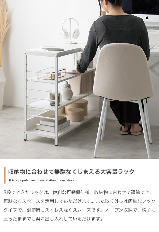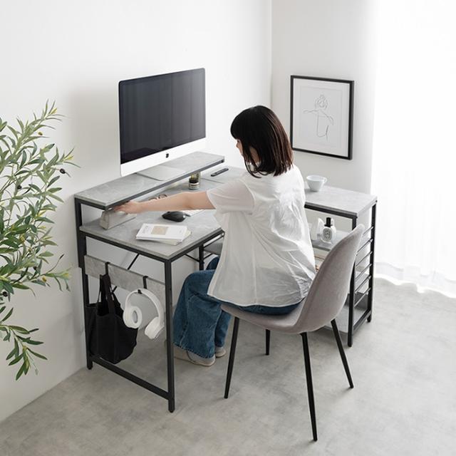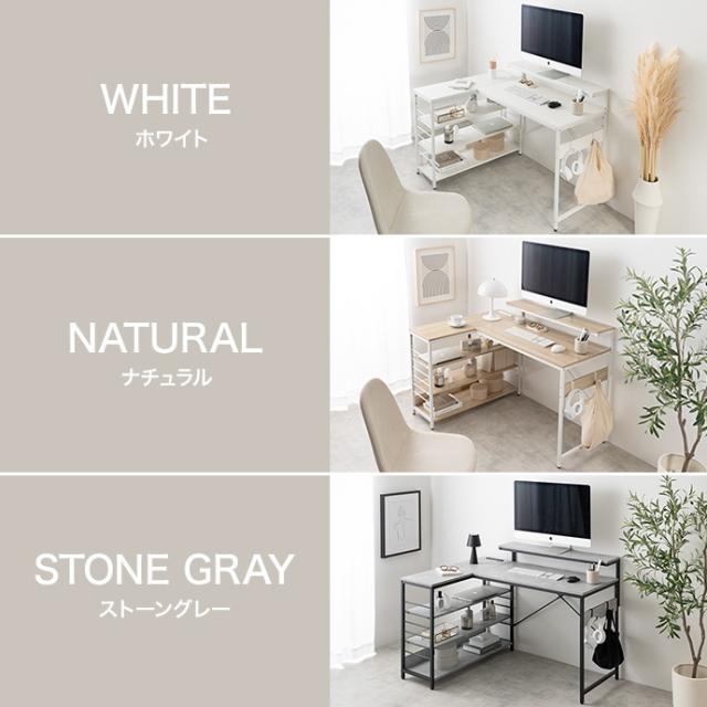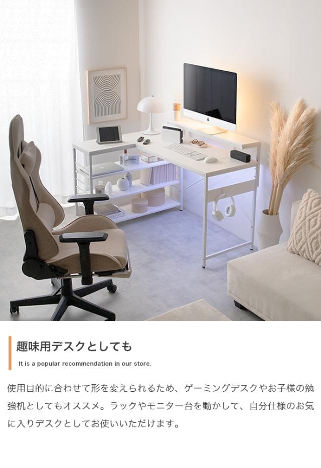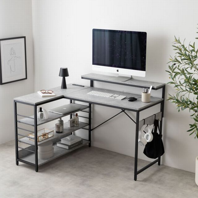 デスク、モニター台、ラックが一体となったL字型デスク。