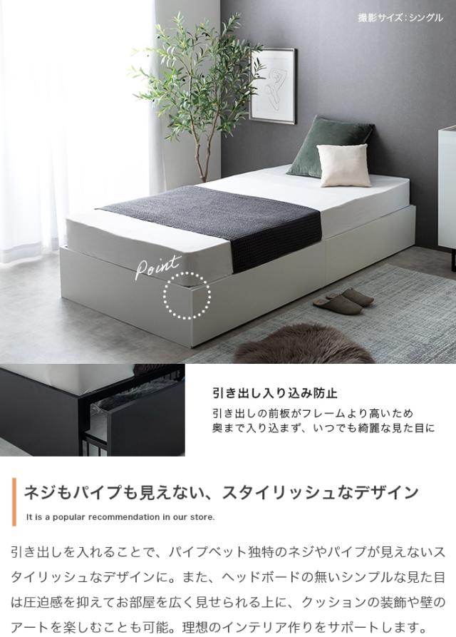 スタイリッシュな美しさとパイプの耐久性を兼ね備えた引出し収納ベッド。